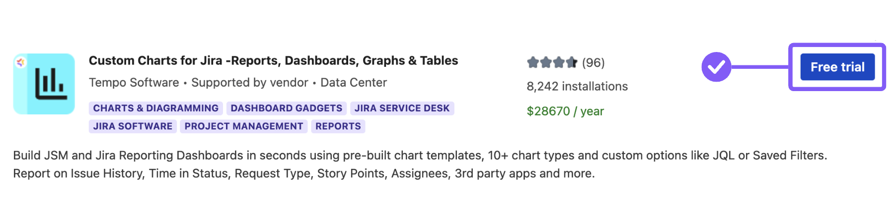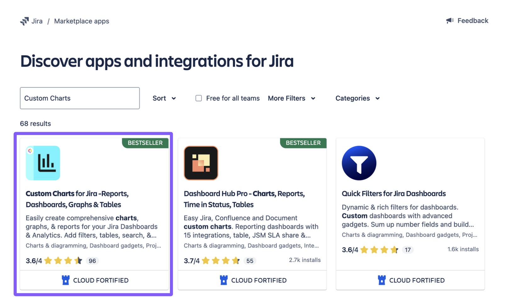 In the search bar, type Custom Charts and click the panel for the app (“Custom Charts for Jira Reports and Jira Dashboard Filter”)