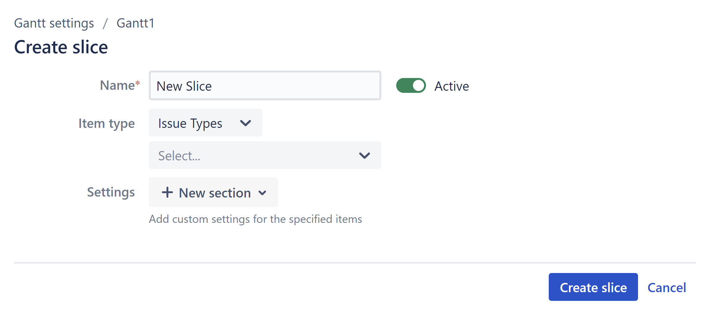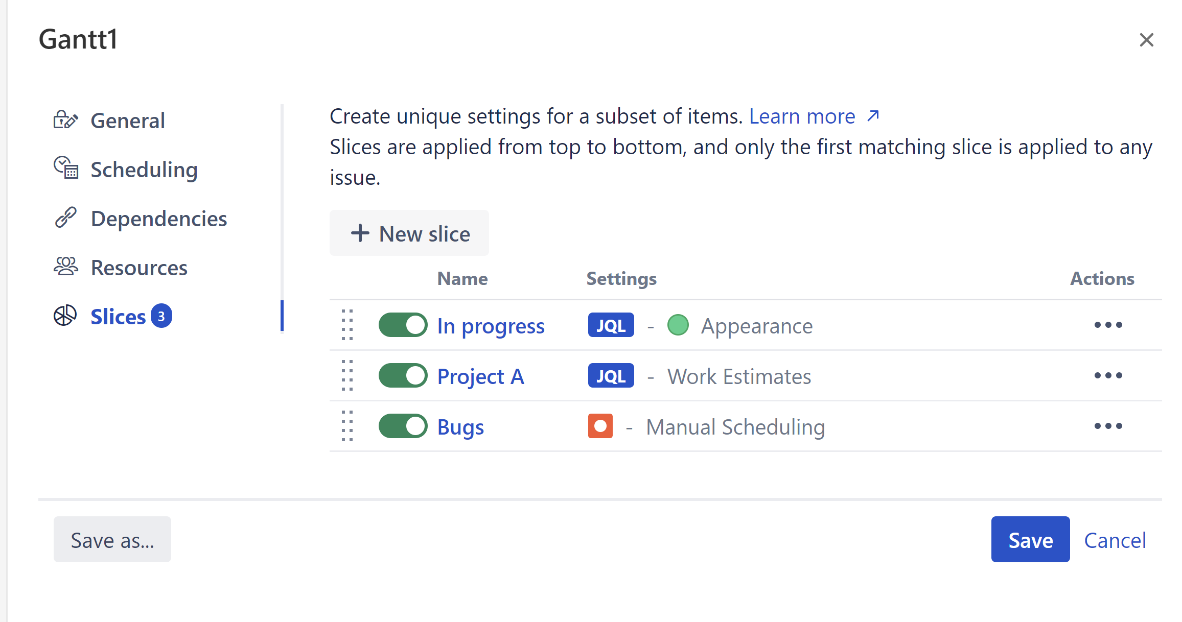 To create a new slice, open the Gantt chart configuration you want to apply the slice to, choose Slices from the left menu, and click the New Slice button.