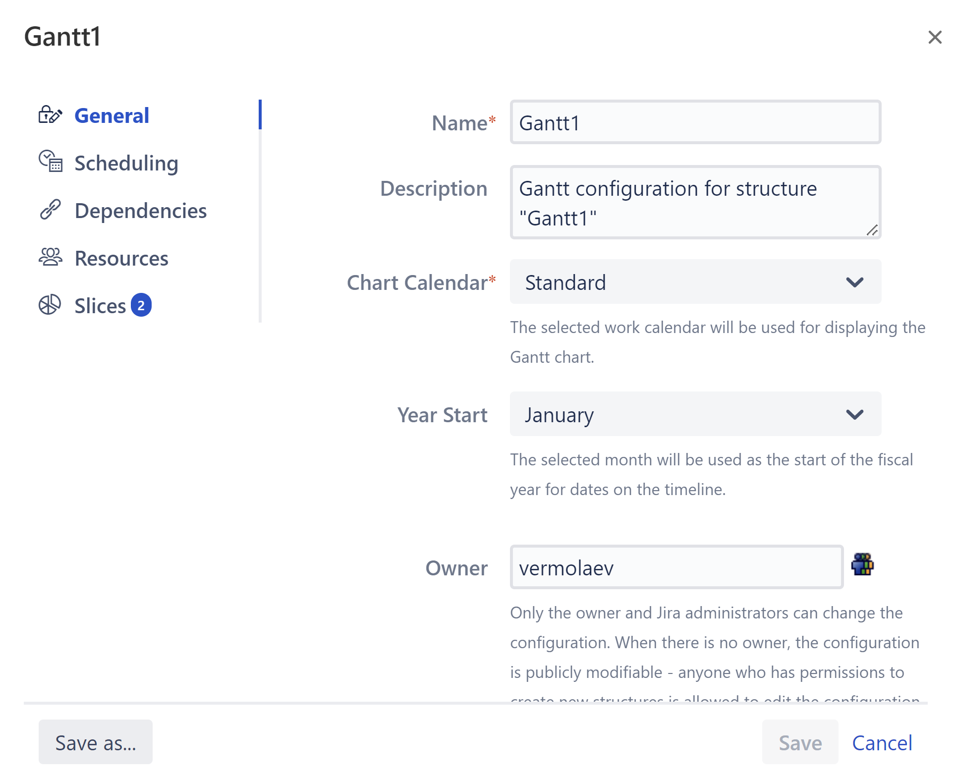 If you share your configuration, and someone uses it in their Gantt chart, you may not be able to delete it. Additionally, shared configurations without a specified owner can be edited by anyone, which could result in changes to your chart. See Permissions for more details.