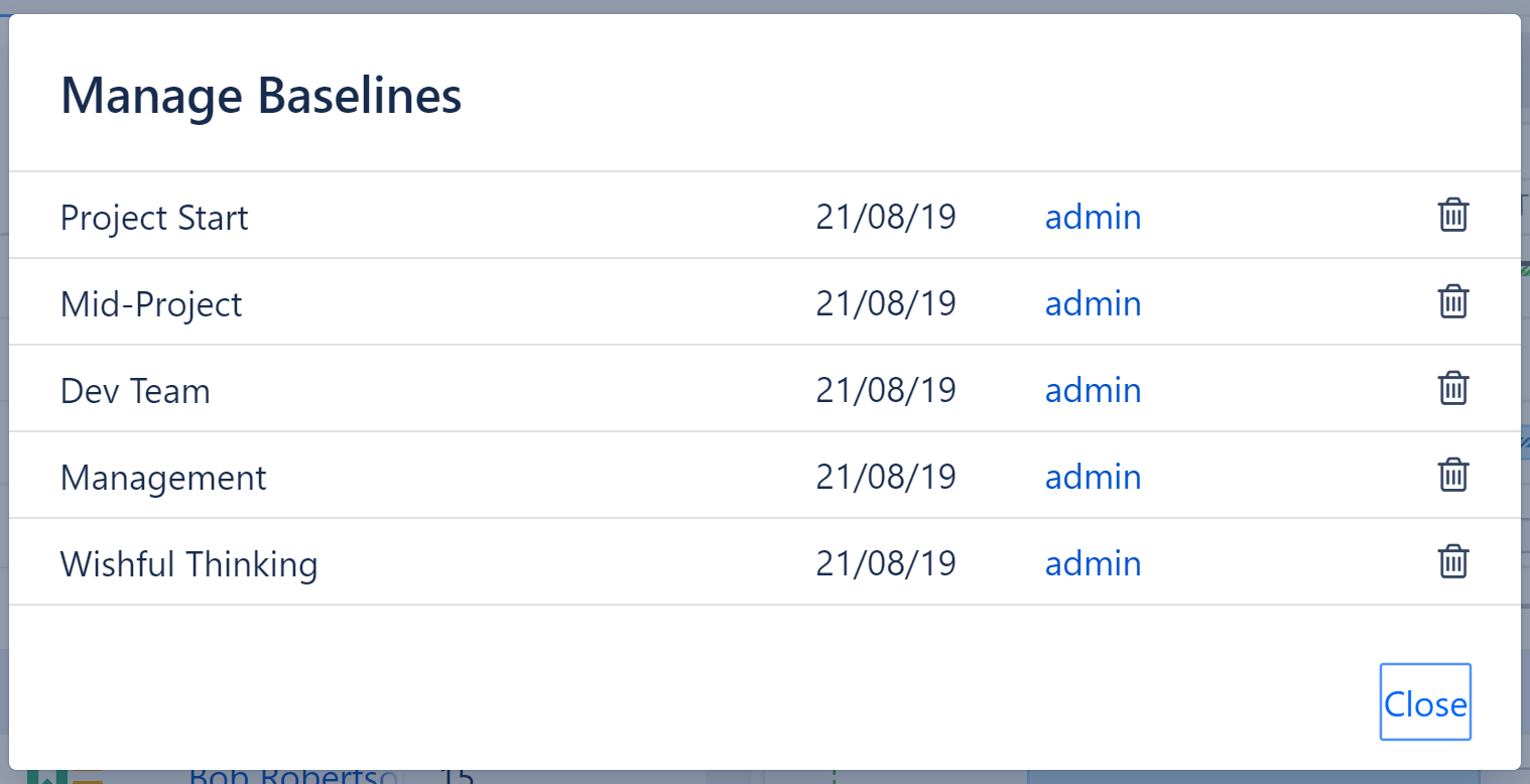 On the Manage Baselines screen, you will see a list of saved baselines, when they were created and who created them.