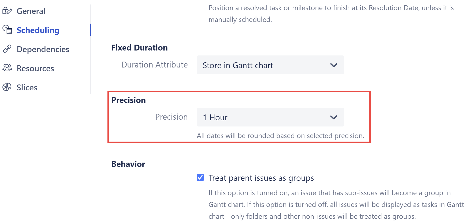 Precision defines the minimum meaningful amount of work. All date, time, and duration values in your chart are rounded according to the selected precision. When rounding for precision: