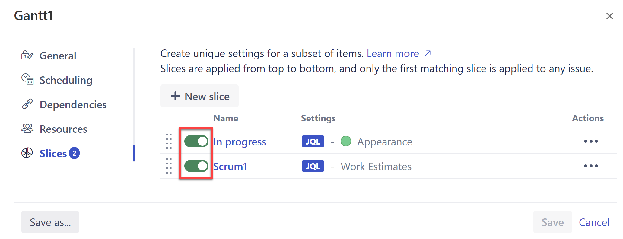 You can turn a slice on or off with the Active toggle next to the slice name. Inactive slices will remain in your slice list (in case you want to reactivate them later) but will not affect your Gantt chart.