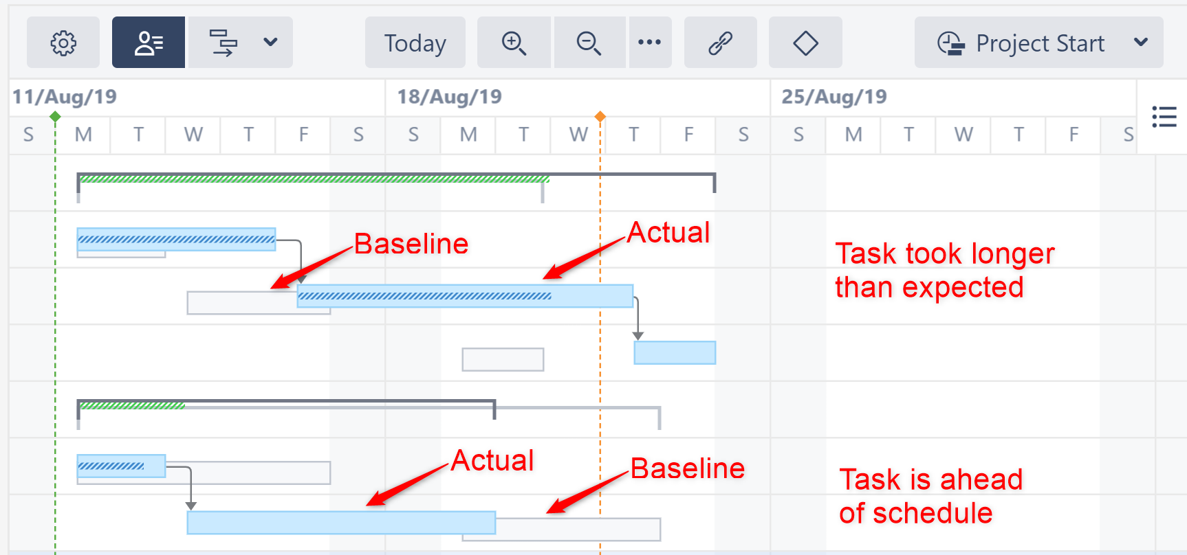 Baselines create a snapshot of the schedule at a specific time, which can then be visualized alongside the current schedule, making it easy to identify differences between a proposed schedule and a project's actual progress. Baselines can be added to the Structure.Gantt gadget and included in a PDF or SVG export.