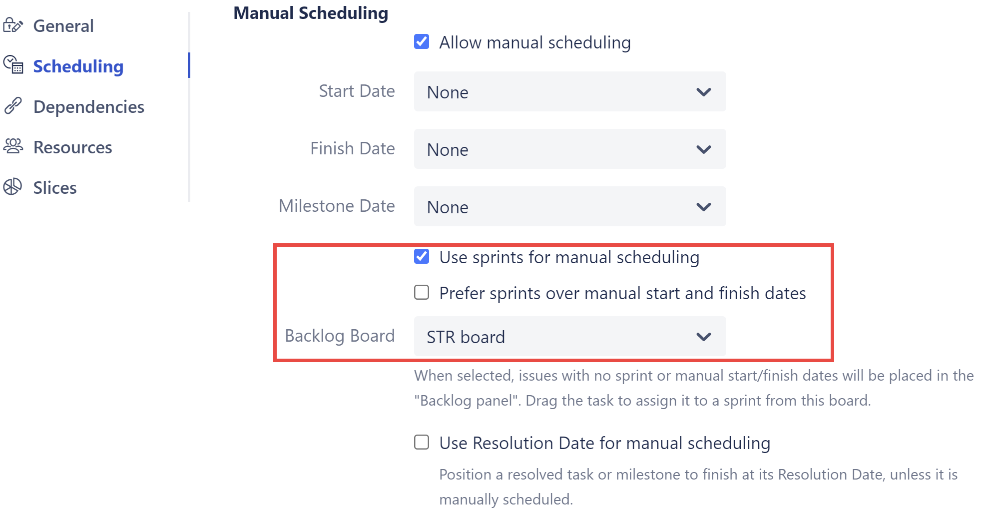 If this option is selected, issues that are assigned to a sprint will automatically be scheduled based on the sprint. If this option is not selected, issues with manual Start or Finish dates will be scheduled based on those, regardless of their sprint assignment.