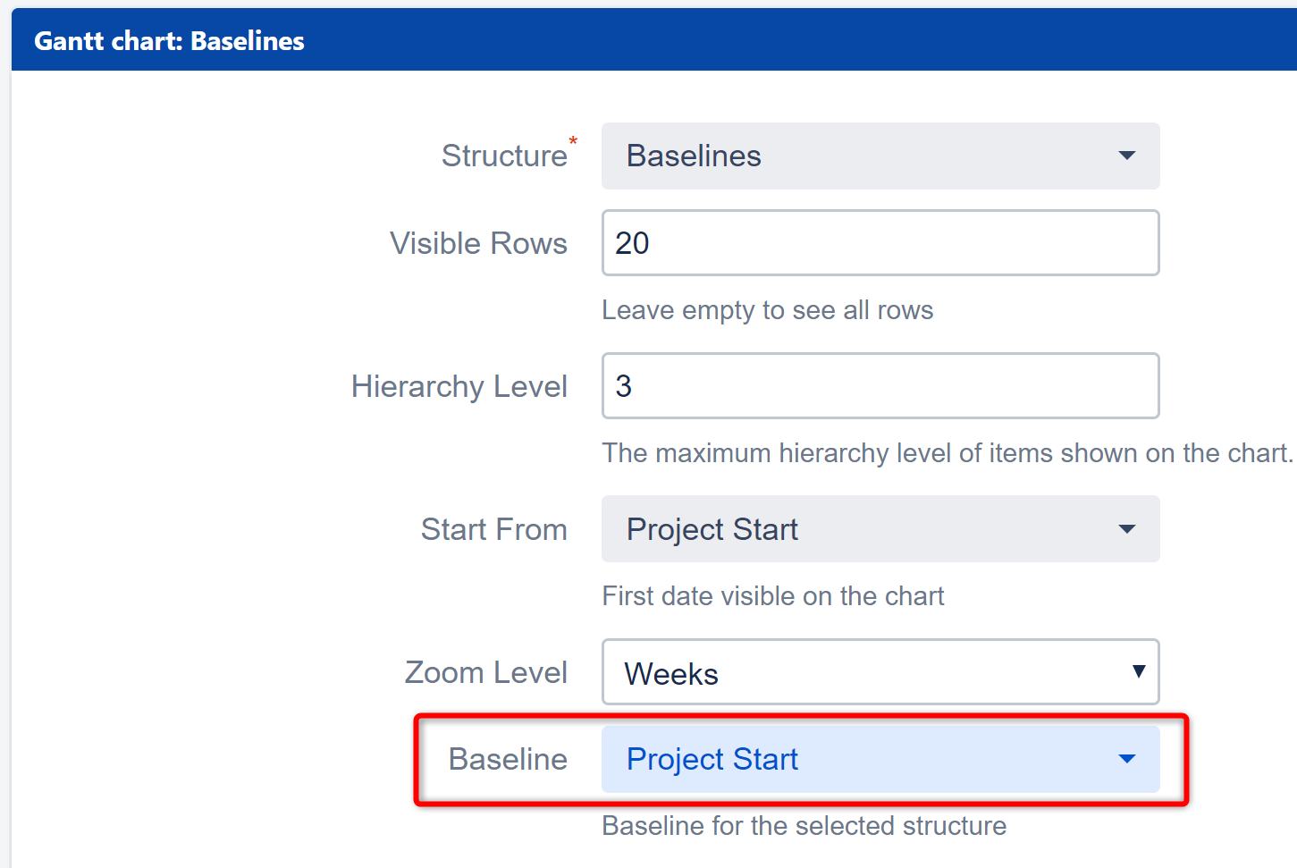 Baselines can be included in Dashboard gadgets and Confluence gadgets. To enable baselines, simply select the baseline you want to include in the gadget settings dialogue.