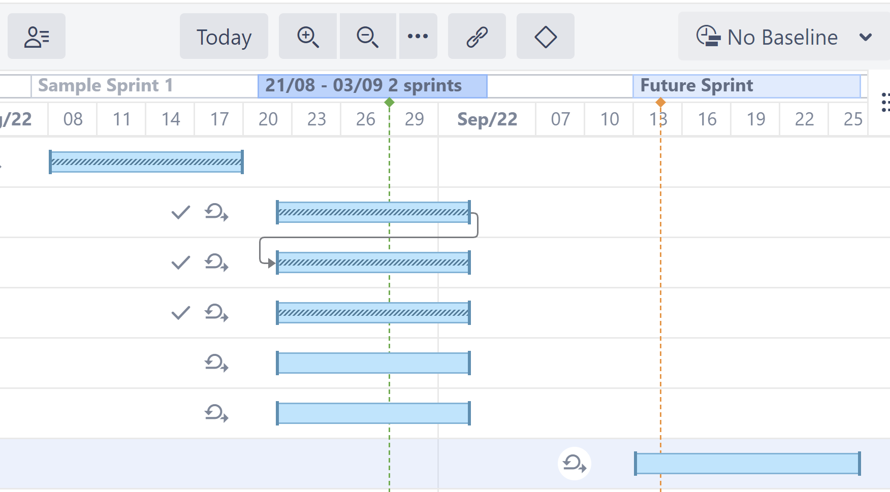 The first future sprint is scheduled for the Sprint start day immediately following the end of the active sprint. If the active sprint ends on the same day of the week as the Sprint start day, Gantt will visualize the active sprint ending on the previous day.