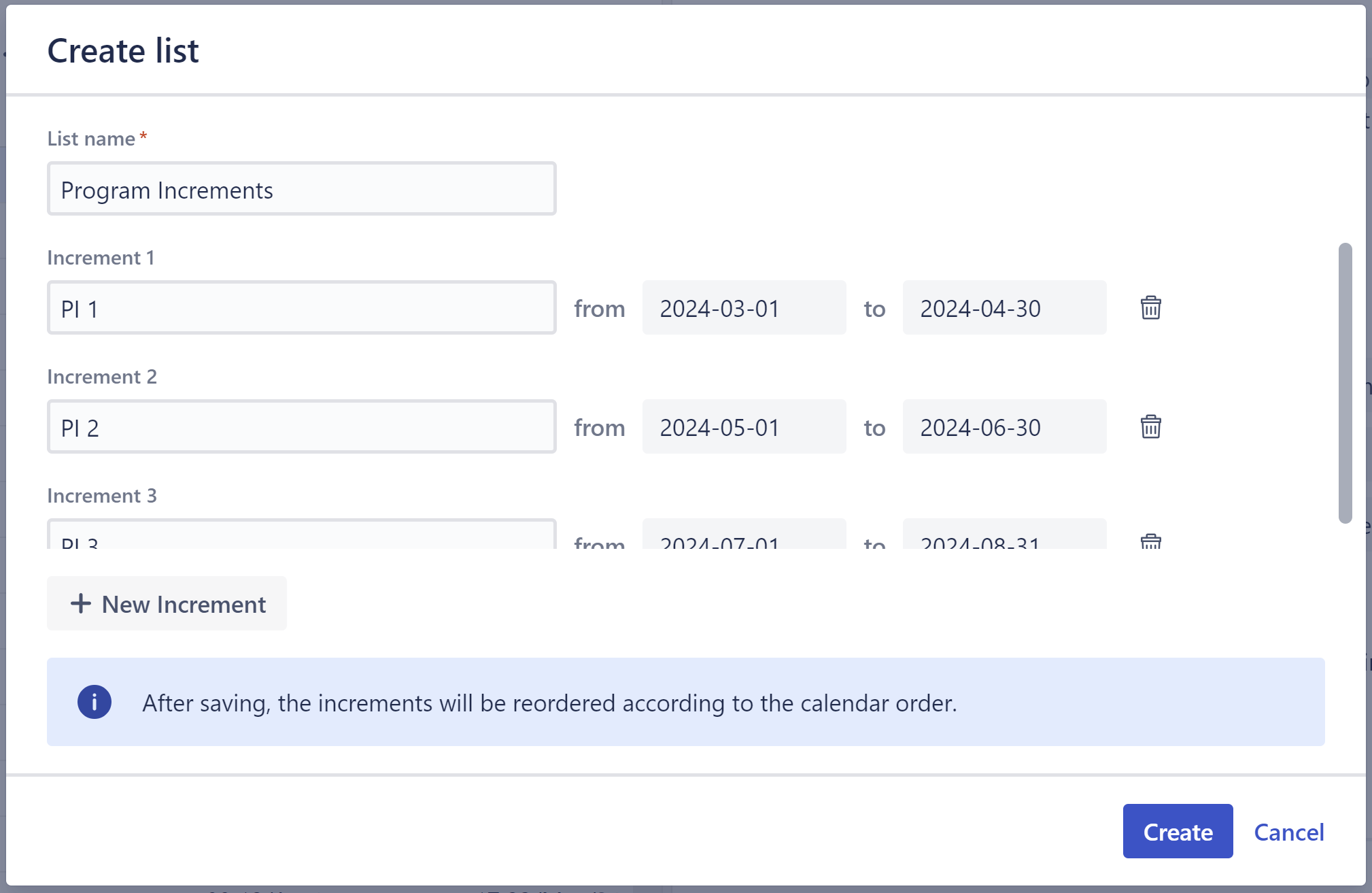 SAFe view allows you to customize the header with your own program increments, or other time-related lists.
