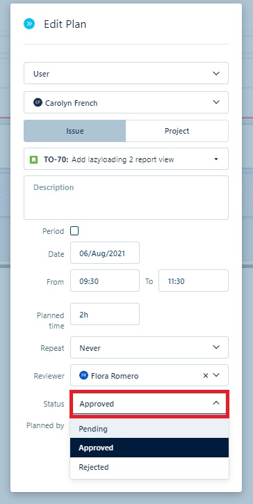 In the Resource Planning view, choose the period of the plan on the top left side. Then you can either filter by user or scroll down to the user you need to approve a plan. Click on the user to expand the planning details and click on the plan.