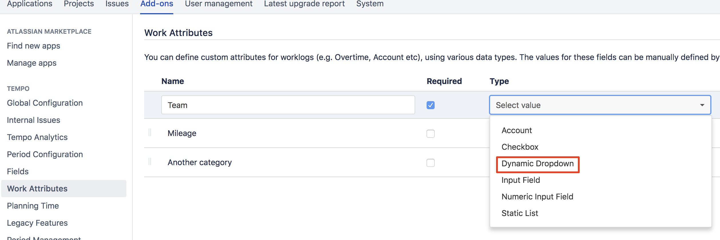 First, create the worklog attribute field from the Tempo Administration section. Select the type "Dynamic Dropdown":
