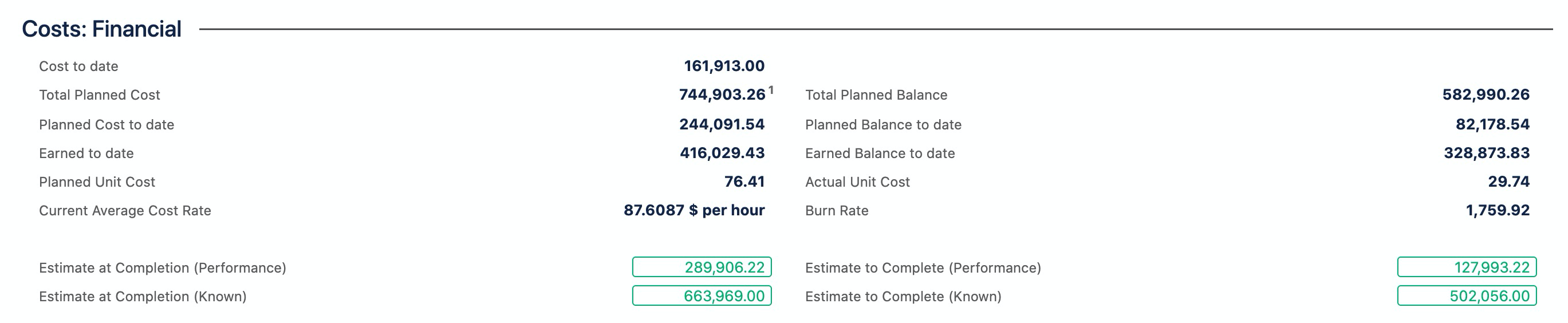 There are different approaches on how to calculate the remaining estimates of a project (ETC/EAC). Tempo Budgets offers two calculation scenarios. The first scenario is based on performance and the second scenario (only visible on the cost/revenue summary page) is based on Forecasting known future costs .