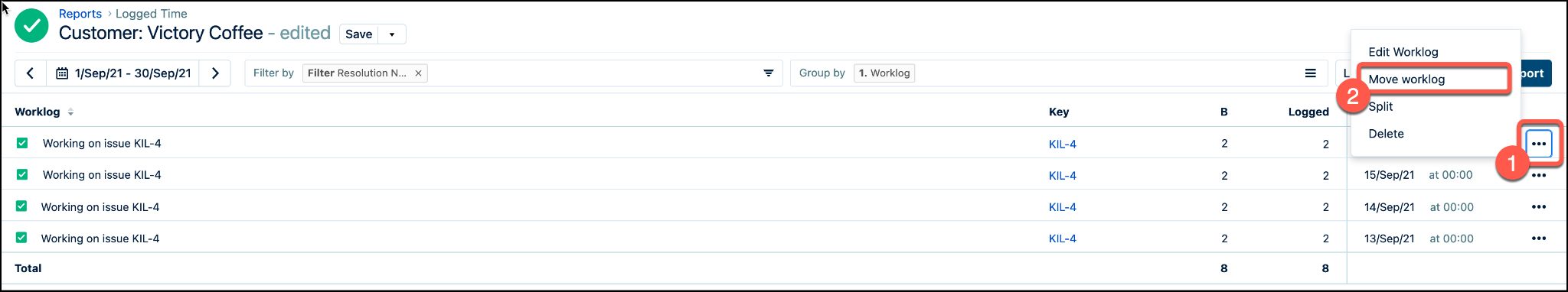 Editing Work Logged Against Closed Issues Occasionally, you may find yourself in a situation where you need to move a worklog to a different issue - in our case, time was logged against a closed issue. To move the worklog to the correct issue, follow the steps above to open your Logged Time report. Use a saved JQL filter to drill down to the issues you want to move. In our case, we created a filter to find recently edited worklogs associated with closed issues. Your needs may differ, but setting ‘Resolution Is Not Empty’ will show you closed issues. On the row you want to edit, click the three dots (More) options at the right end. ![]()