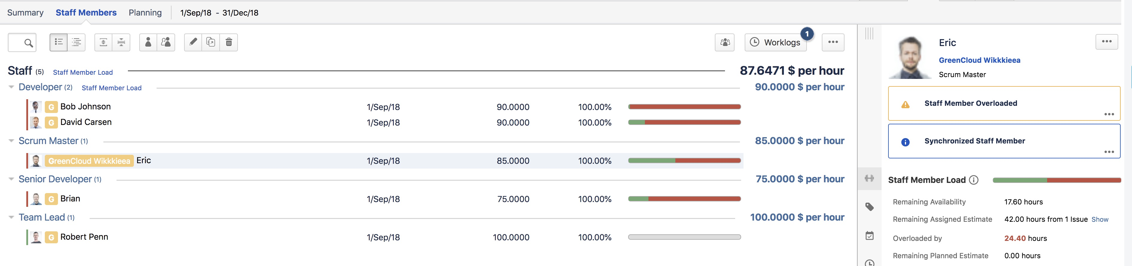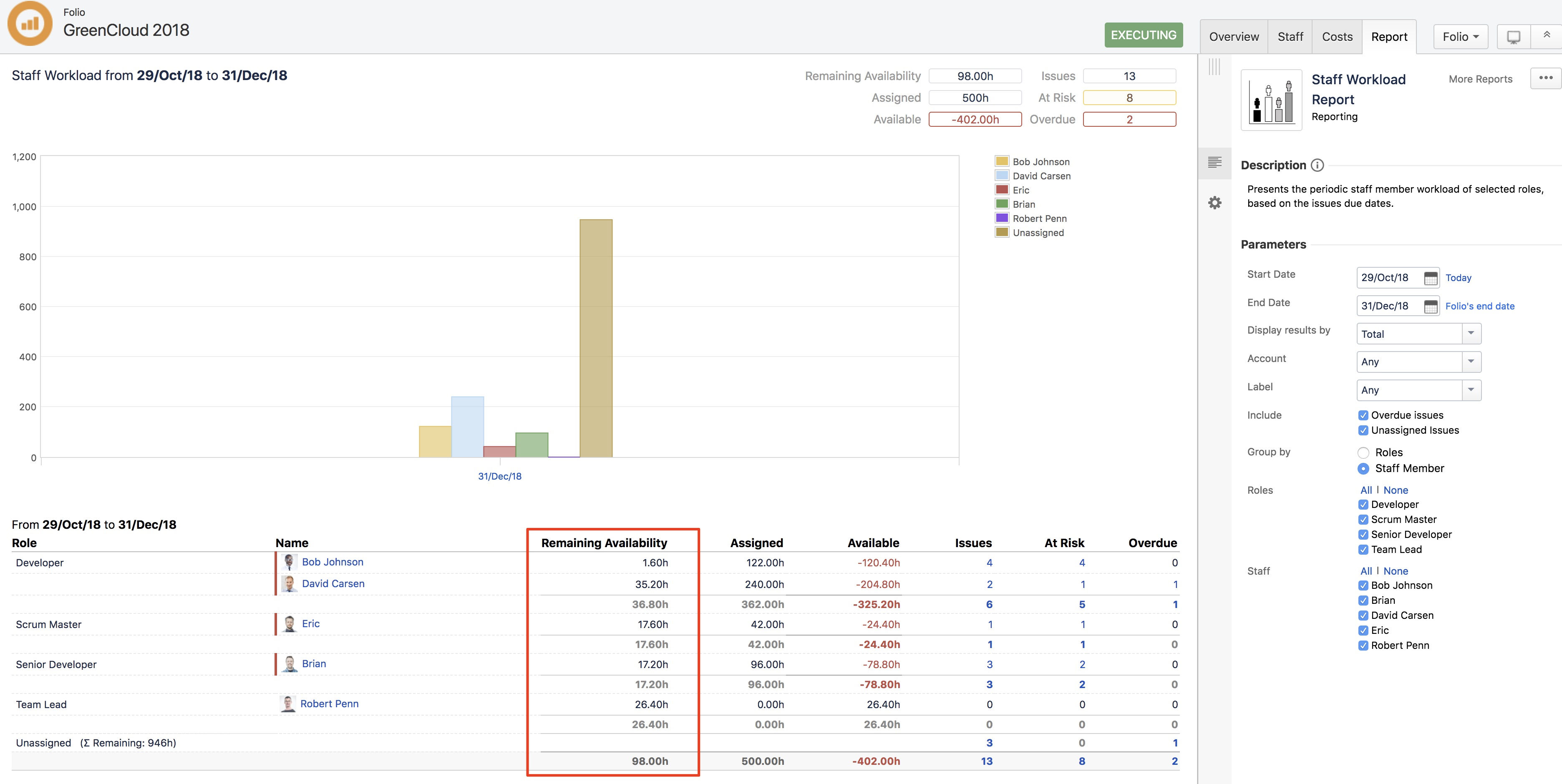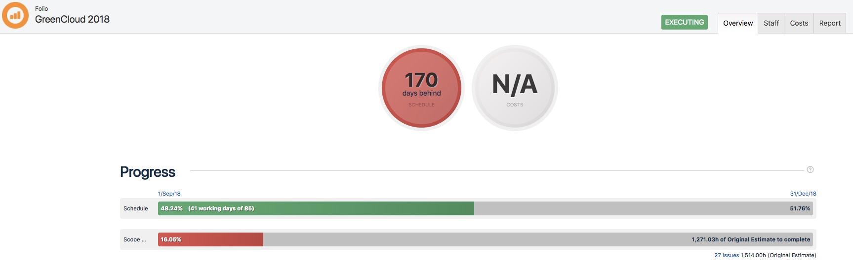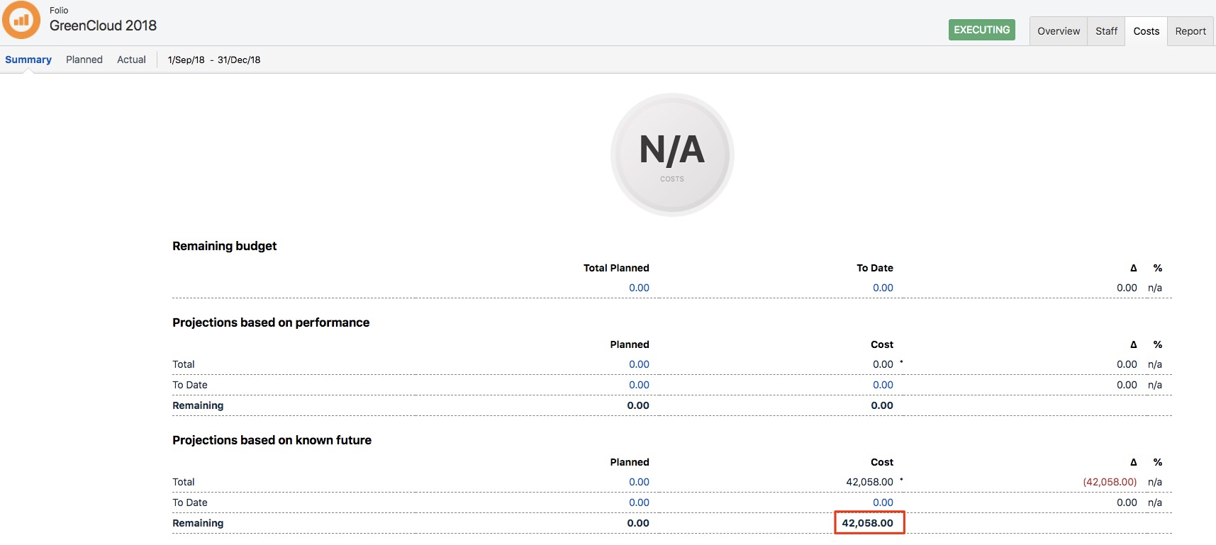 Answer | In a previous article I explained how the projections based on performance are calculated. But Tempo Budgets also predicts a cost scenario based on "known future costs". "Known future costs" are costs that will accrue when my staff is working on the scope of a Folio until the projected end date according to the commitment of the staff to the Folio. In this article I will explain this scenario in detail using a simple use case. In the example Folio GreenCloud 2018 I assigned a Tempo Team (GreenCloud Wikkkieea) to the Folio with a commitment of 10%. The team GreenCloud Wikkkieea consists of 5 team members (Bob Johnson, David Carsen, Eric, Brian and Robert Penn). When we pull up the "Staff workload report" from the report section we will the remaining availability of my staff members until the scheduled end of my project (31.12.2018). ![]() From the staff section of my Folio I see the hourly cost rate of my team members (if I have the permission to view the cost rates). ![]() Based on the remaining availabilty and the cost rates for the team members the remaining costs until the scheduled end of my project are calculated as: Remaining availability x cost rates That results in remaining costs for Bob of 144$ (1.6 hours x 90$/hour), David 3,168$, Eric 1,496$, Brian 1,290$ and Robert 2,640$, in total 8,738$. The reason why Bob´s availabilty is so little is because of his team membership ends in two days (end of October). But that´s not the whole story. Because my Folio might be ahead or behind schedule the known future costs might be different for the calculated number above. From the Folios overview page I see that my Folio is running late and I am 170 days behind schedule. ![]() The assumption is that my staff is working on the Folio with the predicted commitment. The "additional costs" would be calculated as: Team member commitment x workload x days behind schedule x cost rates x Commitment to the Folio Robert, e.g. has a commitment to the team GreenCloud Wikkkieea of 75% and a workload of 8 hours a day (according to his workload scheme). That results in an additional known cost of: 0.75 x 8 hours x 170 days x 100 $/hour x 0.1 = 10,200 $. If we repeat the same steps for the other staff members we would calculated a remaining known cost for David of 12,240$, Eric 5,780$ and Brian 10,200$, in total 33,320$. Bob does not have any remaining costs as his memberships ends before the scheduled end date. That makes a predicted known future cost of 8,738$ (until the scheduled end of the Folio) + 33,320$ (because we are behind schedule) in total 42,058$. When we switch to the costs overview page we will see exactly the calculated financial figure: ![]() Might worth a mention: ALL actual costs (labour and other expenses) and recorded future actual non-labour costs are added and included to the known future costs. |