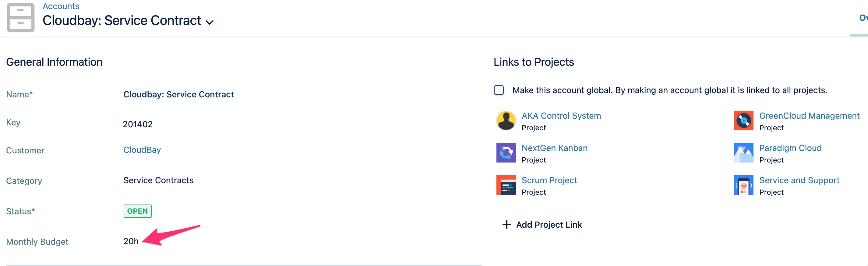 Tempo Accounts are well suited to keep track of service contract efforts. Tempo Accounts can be assigned (as a Jira custom field) to several Jira issues that are distributed in multiple Jira projects. All time tracking information is collected on Account level. In this guide we leverage a long forgotten field inside the Tempo Account which is called “monthly budget”.