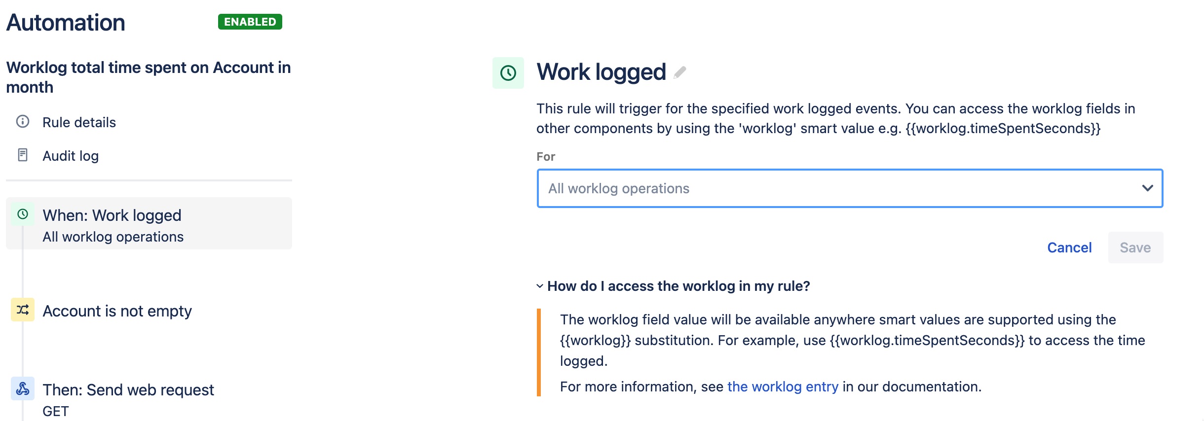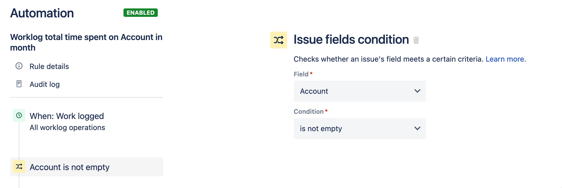Once the worklog event is triggered we can collect all the information for the worklog event during our automation rule. The information we will need is time logged and when but we will also need the Jira issue and its associated information. The first thing to check is if there is a Tempo Account assigned to the Jira issue where the time has been logged against.