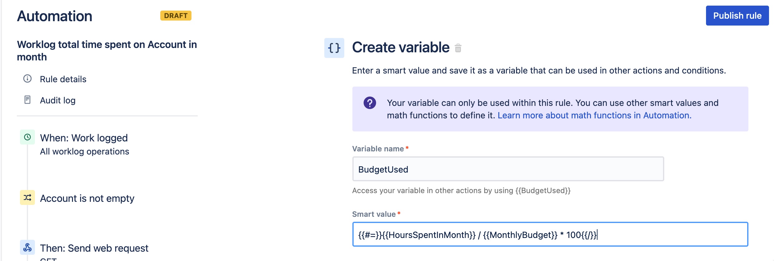 We store the monthly budget information as a variable to access that information later in our automation rule.