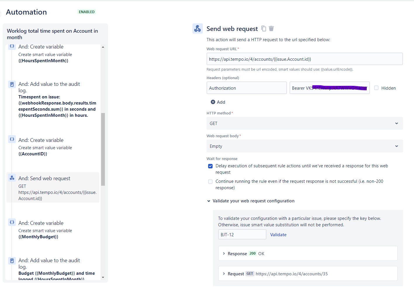 Please check the “Delay …” option. Now we can easily grab the total amount of hours spent from Tempo Account API: