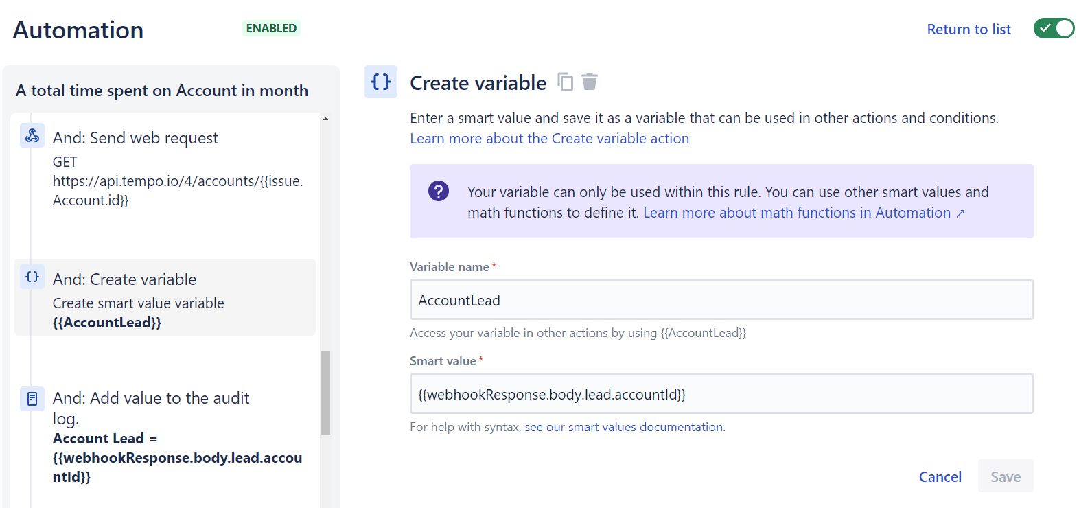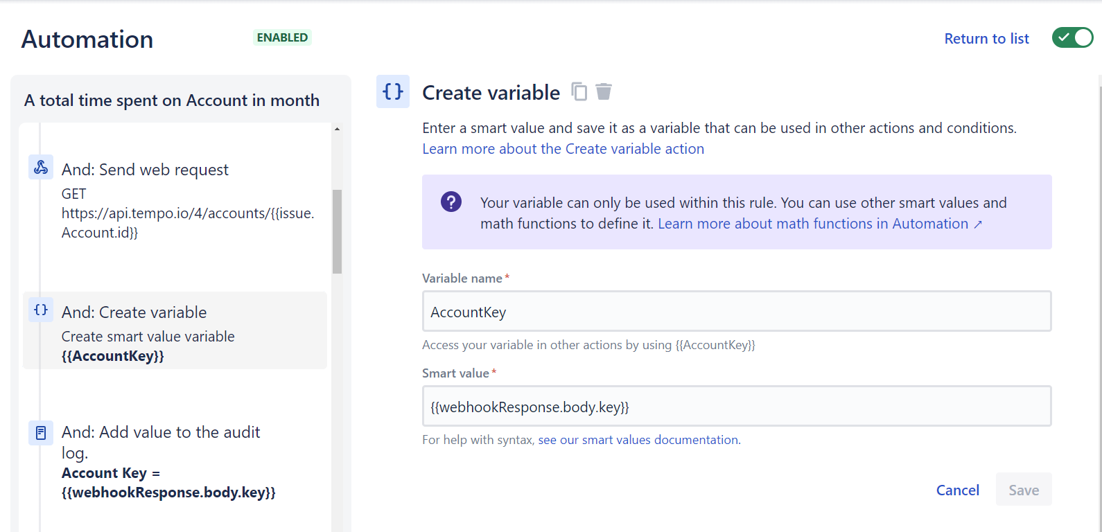 Now we have the information about the Tempo Account on the Jira issue and can access it through the smart value: