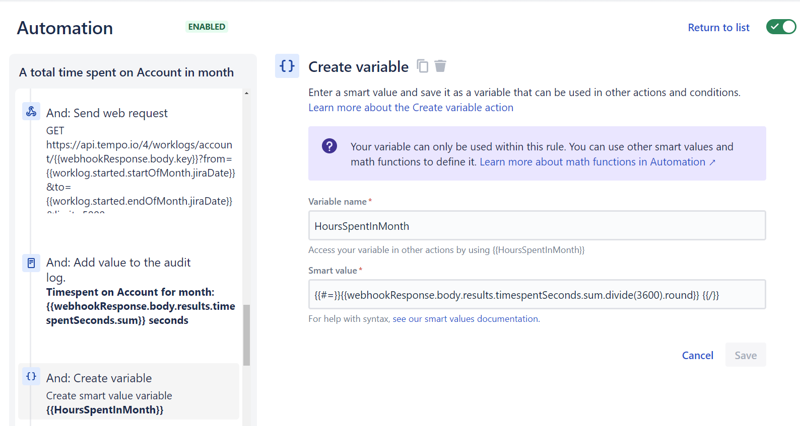 Since it will return the results in seconds, you will need to convert it into “hours” by dividing the sum by 3,600, then round it up to an integer value and store the value as a variable {{HoursSpentInMonth}} to make further calculation easier.