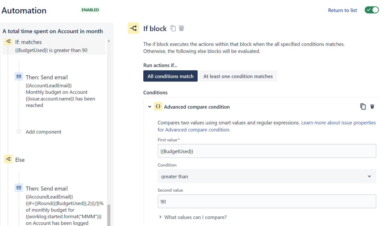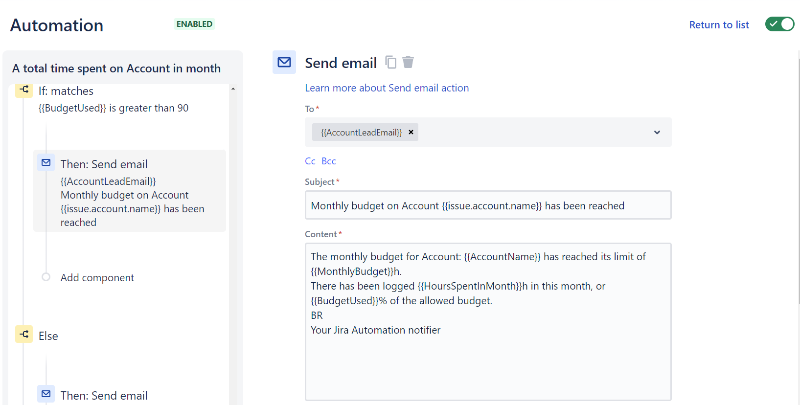On Account {{issue.account.name}} have been logged {{HoursSpentInMonth}} hours out of the monthly budget of {{MonthlyBudget}}h for the month of {{worklog.started.format("MMM")}} {{worklog.started.format("yyyy")}}.