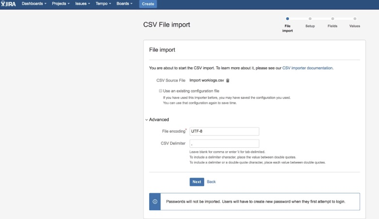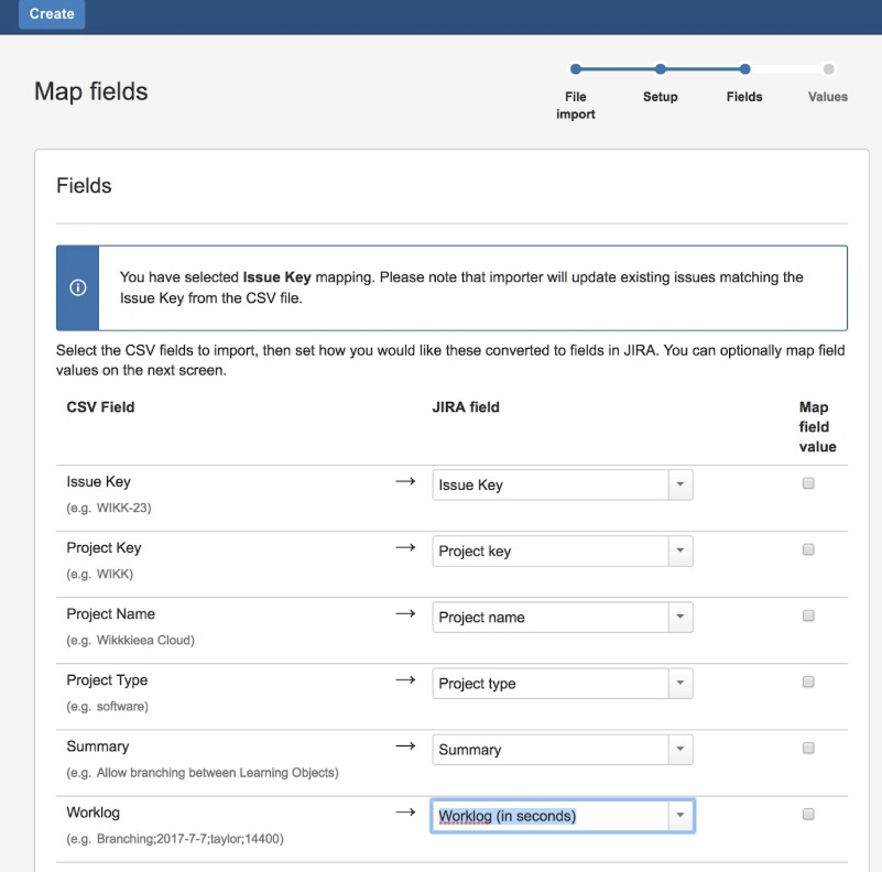 Now we navigate to our JIRA instance to the CSV Import Wizard. Select the .csv file that has just been created and ensure that the appropriate encoding and delimiter have been selected. ![]() Map the projects according to values in the .csv file, and select the date format used in the .csv file. ![]() Select the mapping values in the “Fields” step of the import wizard ![]() You can now import the data. When you have done everything correctly, you will see a message on your screen that confirms the successful import of the worklogs. |