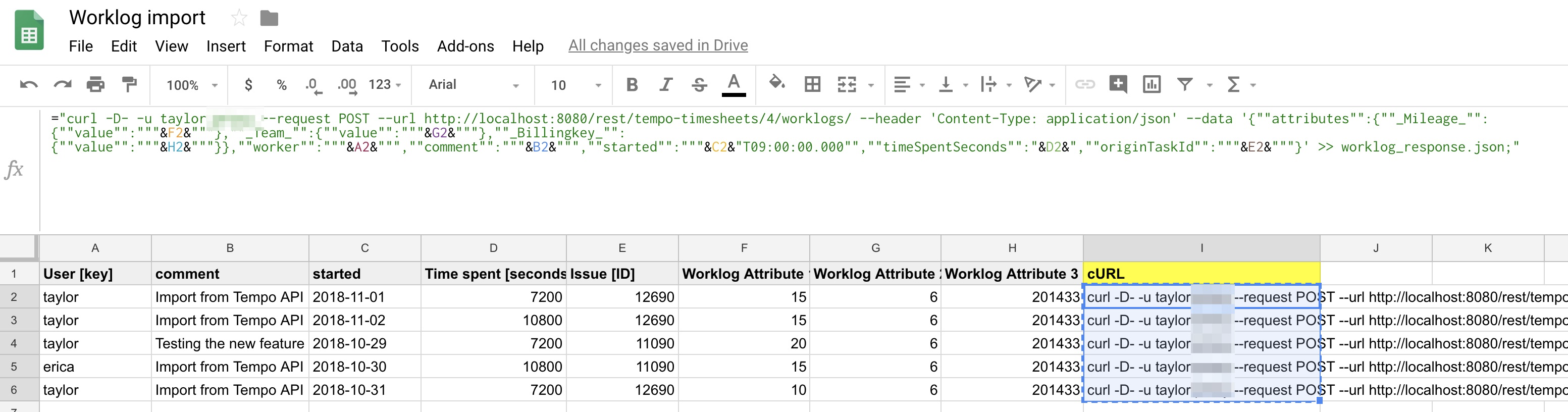 Answer | Worklogs can be imported to Tempo using the native Jira csv import functionality. Note that the Jira .csv import does not support worklog attributes. To import worklogs into Tempo with worklog attributes, you will need to use the Tempo REST API and an app like Postman (or the command line). In the example below, we will create an executable script file that can be run on every computer. 1. Create your Excel sheet with the worklogs that you want to import. Your excel sheet should look similar to this: ![]() 2. The Tempo REST API uses the JSON format to pass the information to Tempo for import. Use Excel to convert the values into a valid JSON format. JSON payload