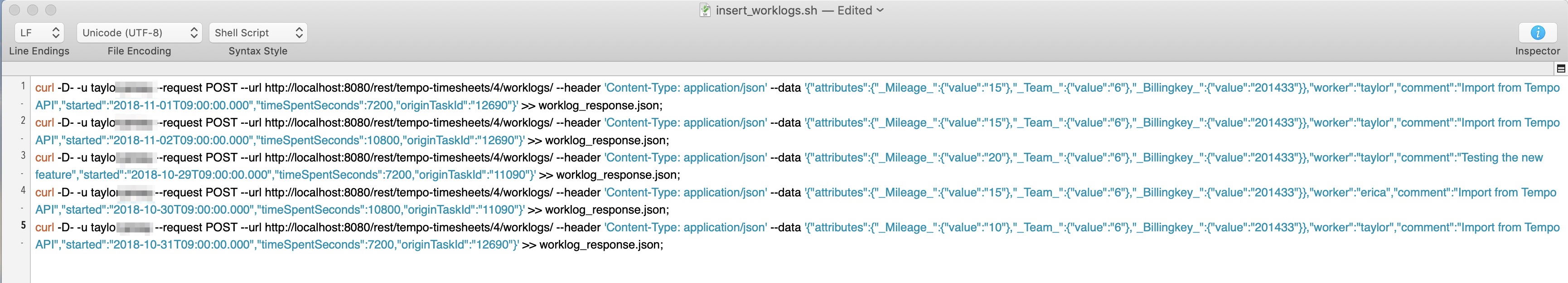 3. Copy the generated cURL command lines from excel and copy them to a text file. Add a "sh" extension to the file and make it executable. ![]() Note that the "Value" for "_Billingkey_" in the cURL command in the above screenshot is "accountKey" and not "accountName". 4. Run the script from your terminal by entering "sh {yourscriptfile}.sh". By adding an output file to your cURL commands you can either check the generated worklogs or in case the import failed you will see an error message. |