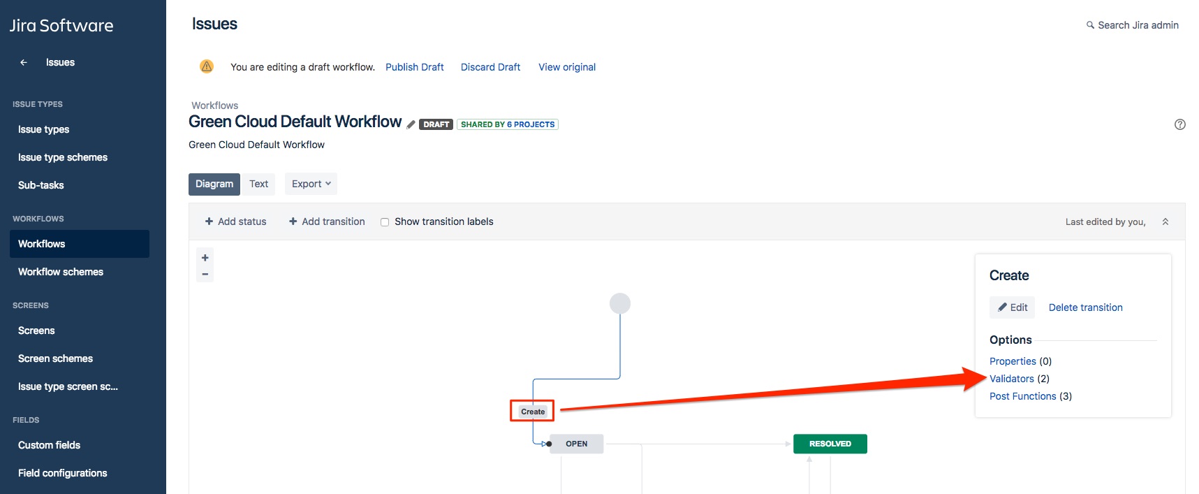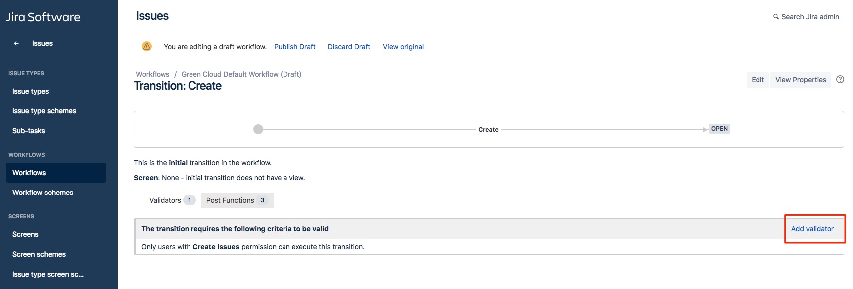 Answer | The Tempo Account custom field can be made a required field by using the standard procedure of a Jira workflow. This ensures that the Tempo Account field is not missing on any Jira issue and all worklog reports will refer to a Tempo Account. If you do not have the Tempo Account field added to your "Create Issue screen" it can still be selected by selecting a default Tempo Account from the Jira project settings menu. Follow the steps below to make the Tempo Account field required from within your Jira workflow. You will need to repeat these steps for each workflow you wish to add this field to. Go to the workflow that is used for your Jira project(s) and click on the workflow diagram to access edit mode. Select the "Create" transition and select "Validators".