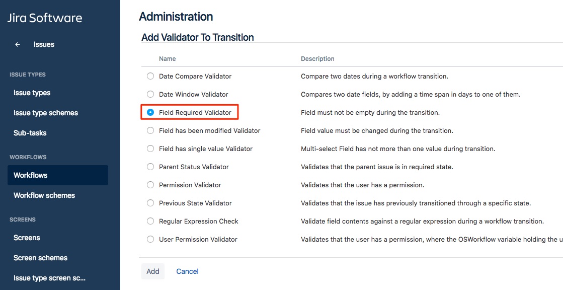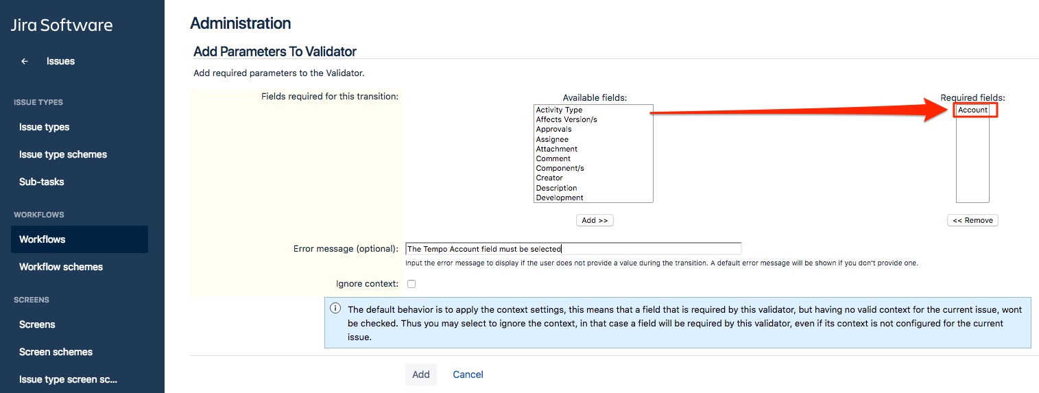 ![]() Select the "Field Required Validator" option ![]() Add the Tempo Account Custom field to the selection. Tempo recommends adding text to the error message field to provide your users with clarity around this field. ![]() You're all set! If you do not select a Tempo Account when creating a Jira issue, you will get the error message you specified above. ![]() |