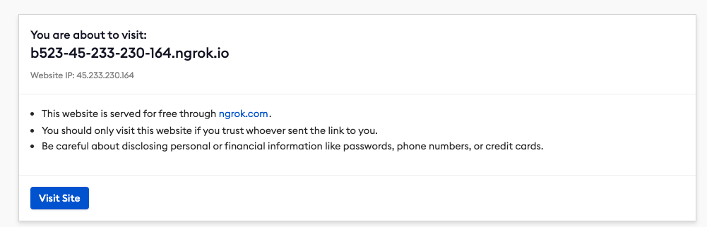 After run the server, open the link generated in your terminal, for you allow ngrok. It will be required every time you run this command.