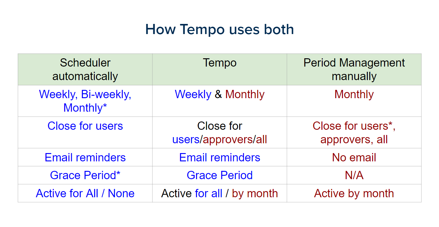 Here at Tempo, we use both features. We have set up the Scheduler to automatically close weekly periods so that users can’t modify their worklogs of previous weeks. Then towards the end of the month, we manually closes our monthly reporting period by Period Management so that managers can’t modify any worklogs after billing.