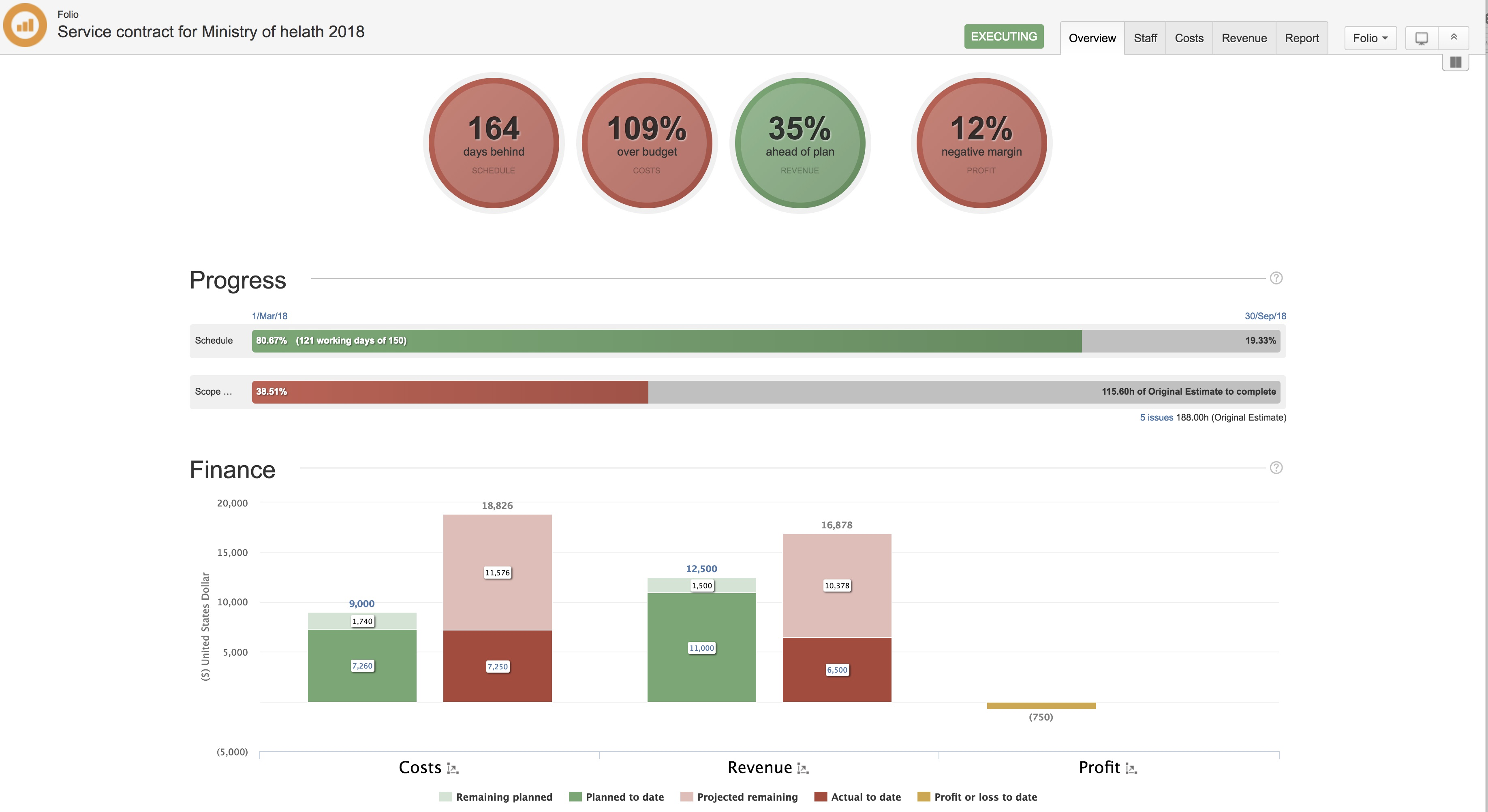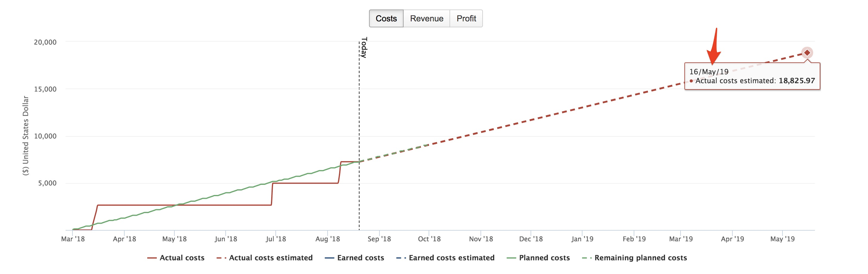 Answer | Tempo Budgets predicts two financial scenarios according to the progress of your scope and the assumptions that you have made for your project. These two scenarios are 1. forecasting based on performance and 2. forecasting based on known costs. The forecasting scenario based on performance is based on the progress of the scope of the Folio and the already elapsed working days of your Folio. The forecasting scenario based on known costs is based on the availability of your staff and all other planned costs. A Folio's overview page always displays the financial forecasting scenario based on performance. The cost's and the revenue's summary page display both forecasting scenarios. From the example below we explain in detail how the forecasted end date and the forecasted end cost of your Folio is calculated. Our sample Folio looks like: ![]() The schedule bar in the progress section tells us that according to our workload calendar (defining the working days of the year) that we have 150 working days in the Foio's time period between the start date (1st march 2018) and the end date 30th September 2018). Until today (20th August 2018) have passed 121 working days. Our costs until today are 7,250$. That means the daily cost burning rate is 7,250$ / 121 days = 59,92 $/day. We see further that the progress of the Folio's scope is 38.51% (more about the progress calculation here). Based on the progress and the elapsed working days Tempo Budgets now calculates the projected working days (and end date). Tempo Budgets assumes that your progress will continue with the same pace which means we use a simple calculation as: Total working days = 100% / 38.51% x 121 working days = 314 working days (rounded - 314.20 is the exact number) . Starting from our start date (1st march 2018) and according to our workload calendar Tempo Budgets is now calculating the 16th of May 2019 as the projected end date. Based on calculated working days we can now calculate the estimated end cost assuming we burn as much money in the rest of the project as we already did so far. So the projected end costs can be computed by: Total project costs = 314.20 days x 59,92 $/day = 18.826.86$ (some rounding errors) or we could also use the progress to calculate the projected end costs by computing: Total project costs = 100% / 38.51% x 7,250$ = 18.826,28$. Looking at the cost graph below of the financial section will show us the projected end date/ projected end cost of our Folio (with some rounding errors). ![]() Based on the calculated numbers we are now able to understand better the calculated figures from the traffic light section on the top of the overview page. We have calculated a projected number of working days of 314 but only estimated 150 days (you see that number in the schedule bar of the progress section. That means we are 164 days behind schedule (314 days - 150 days = 164 days). We have an estimated/ total planned cost of my Folio of 9,000$. Tempo Budgets has forecasted that our projected end costs will be 18.826,28$ at the estimated completion date. That means our costs are 109% over budget. This number is computed by: (18.826,28$ / 9,000$ - 1) x 100% = 109,2%. |
