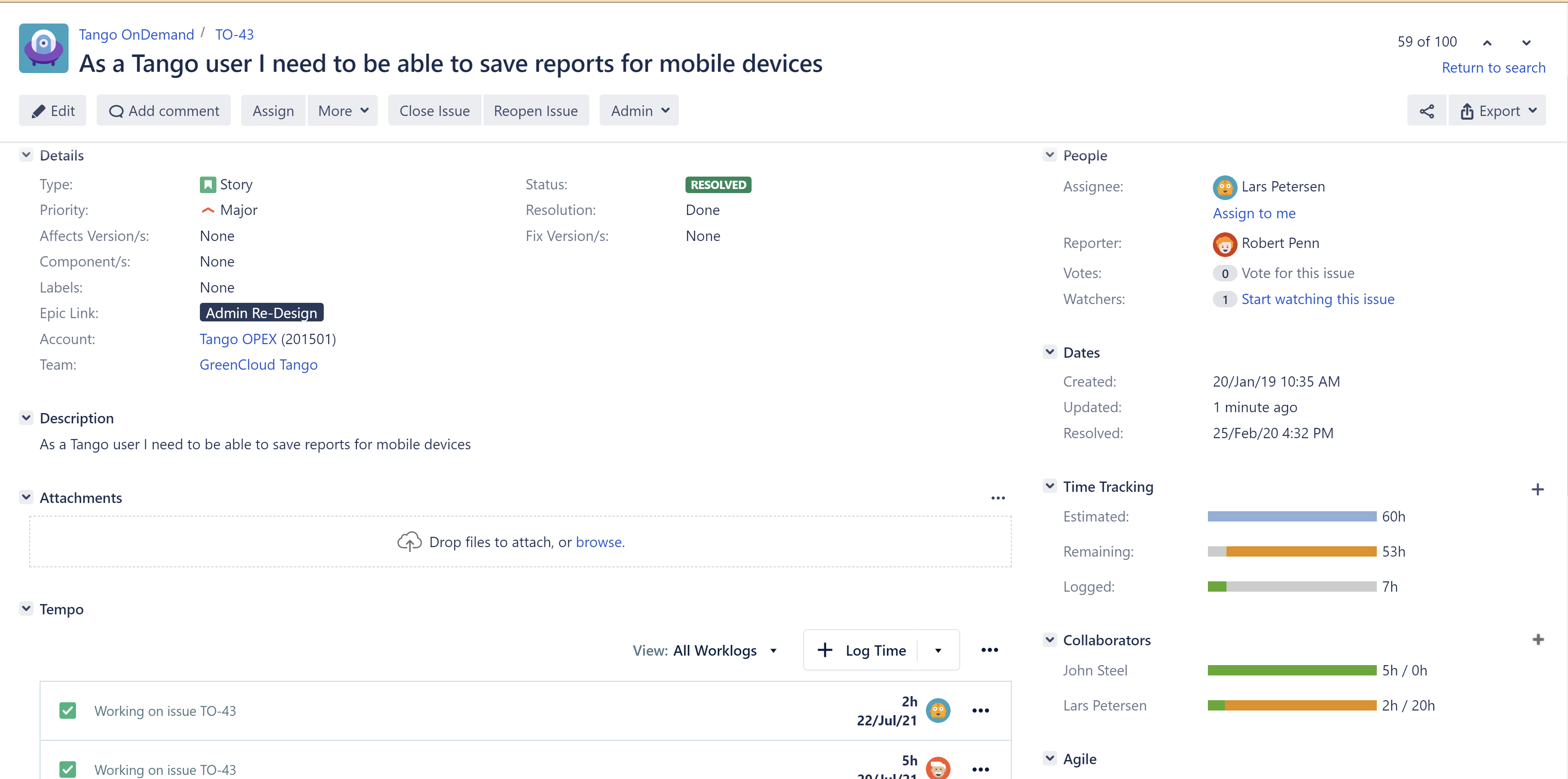 The Collaborators section shows which users have planned time or logged work against the issue. The visibility of information in this panel depends on the permissions the user has (permissions to view worklogs/ plans of other users on project or team level)