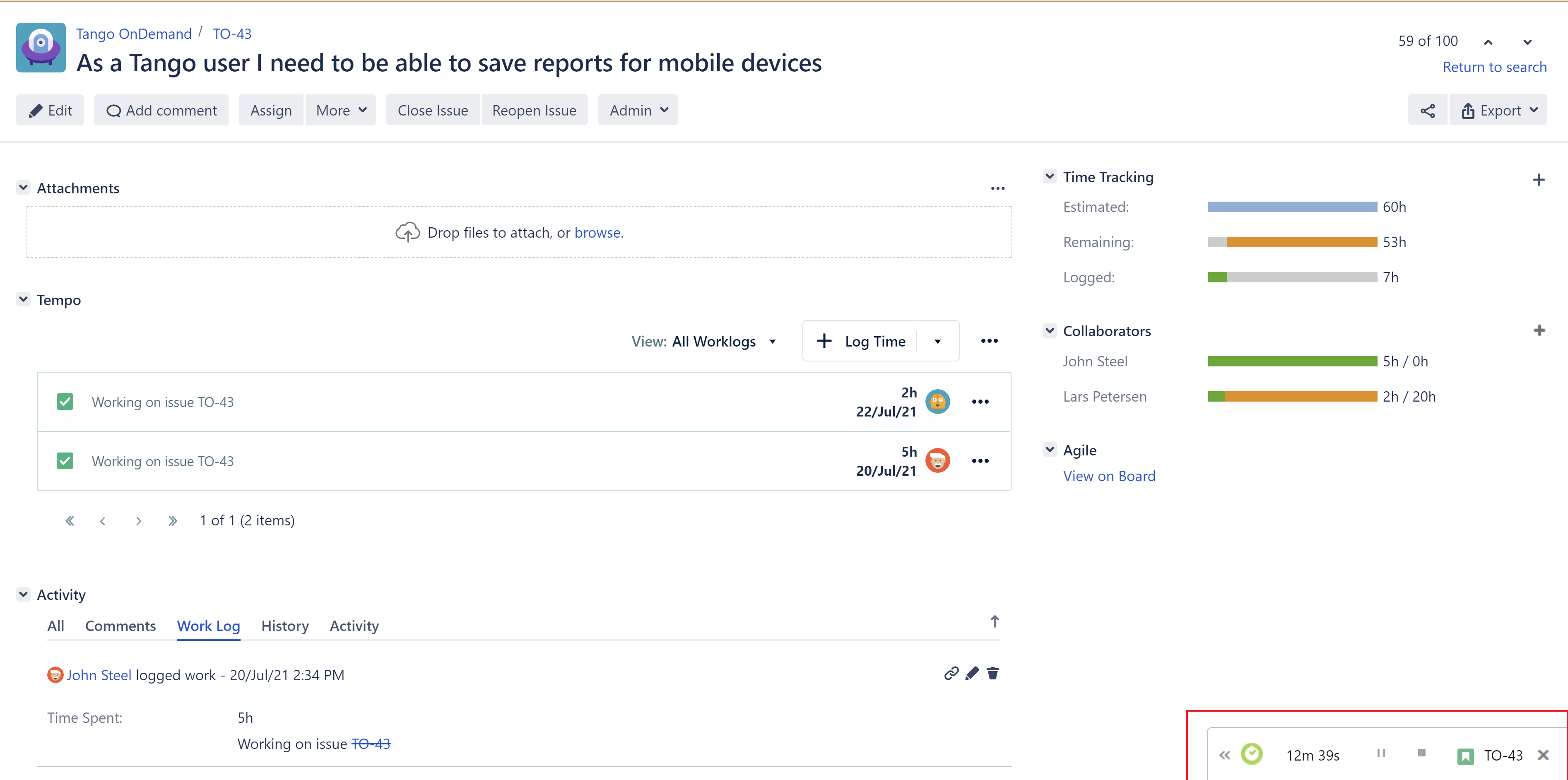 In the sidebar, the Time Tracking panel is added by Tempo, but the information that is shown in the panel (Estimated, Remaining, Logged) is retrieved from the Jira database. The “Log Time” button opens the Tempo Log Time dialog, so users can log work in Tempo.