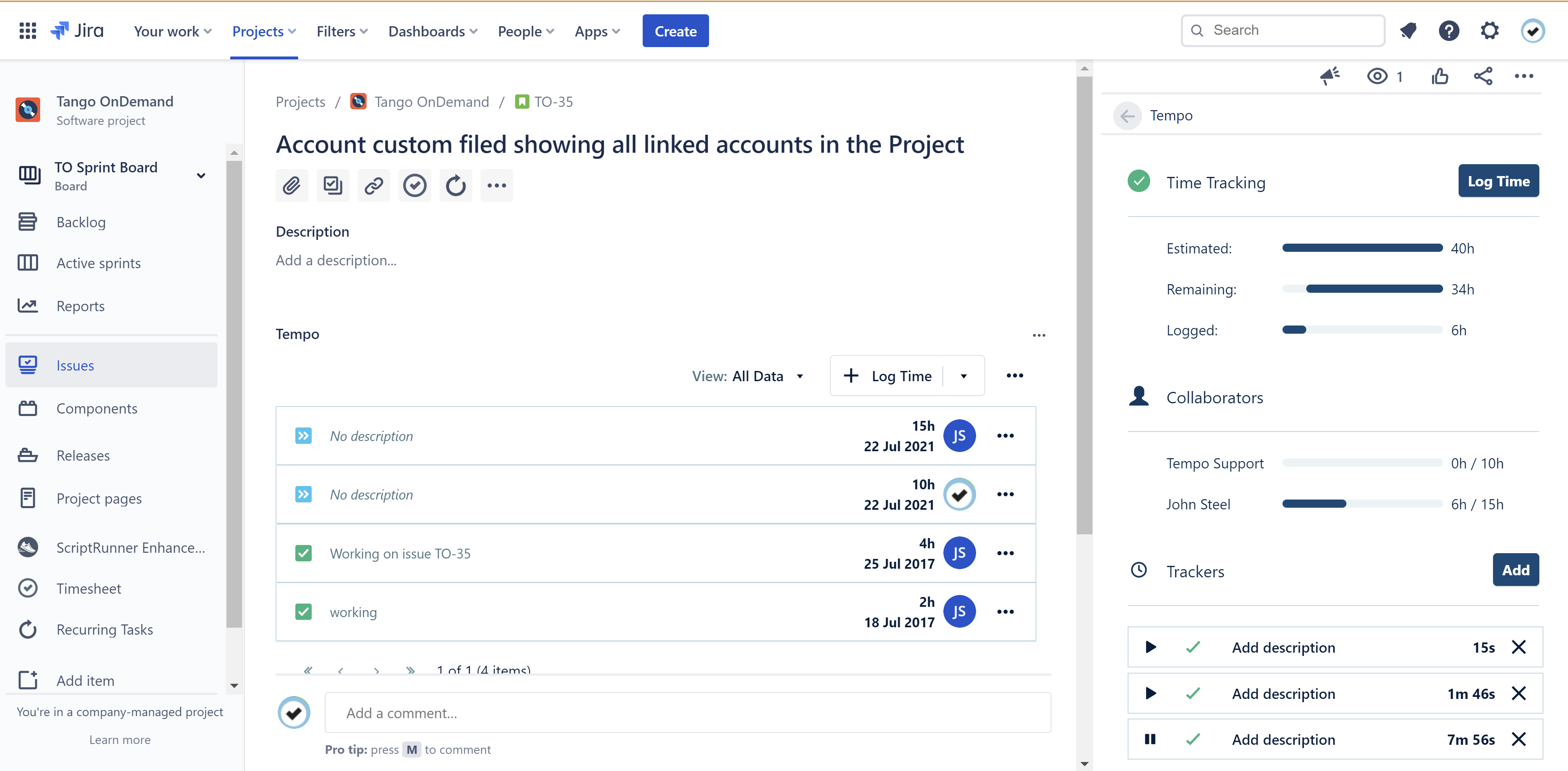 The Trackers section shows the time trackers the viewer has started on the issue. There can be several Trackers at the same time. They are linked to the issue, so when logging work, the issue field is pre-populated with the Issue key and summary.