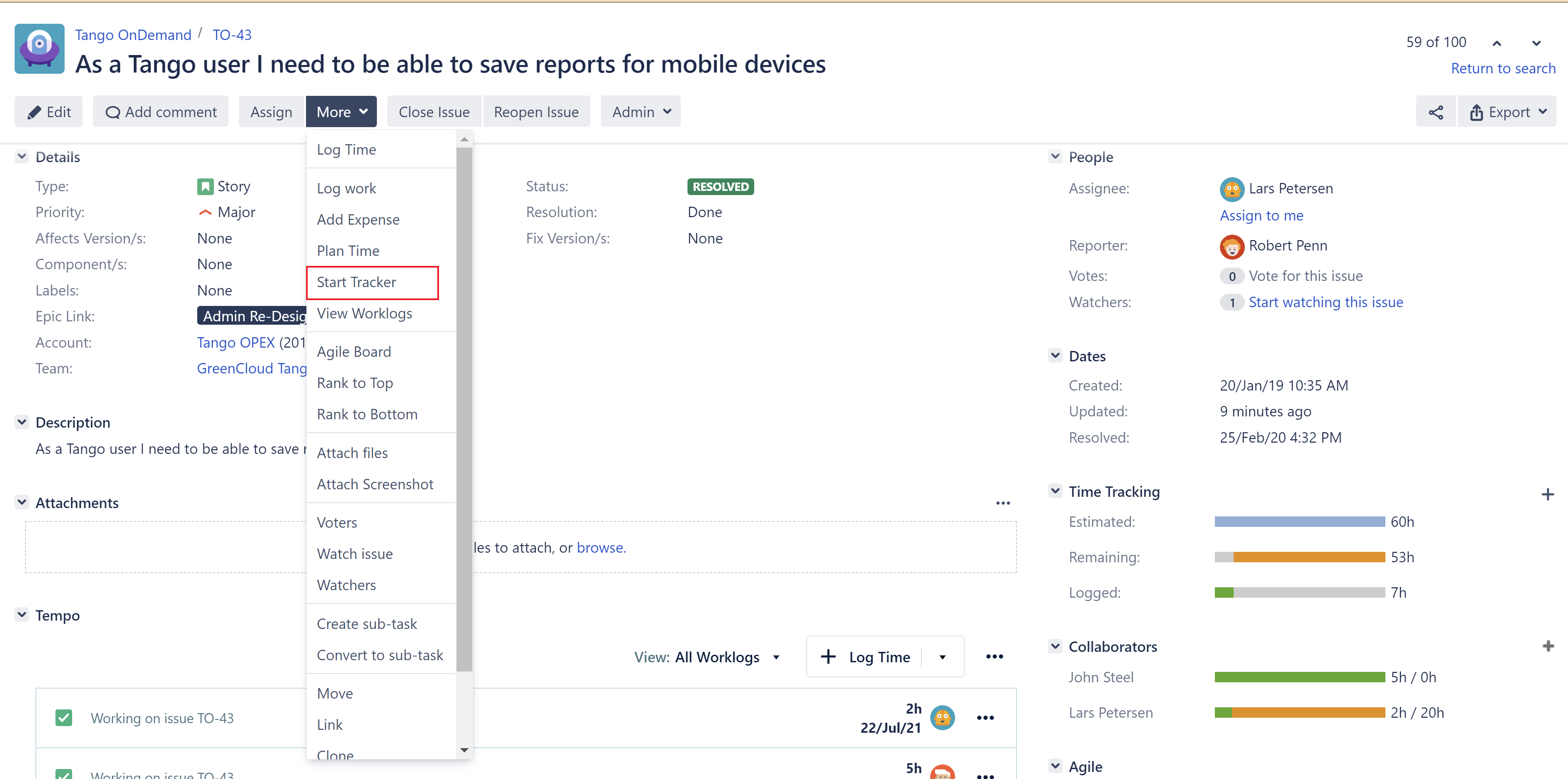 On Data Center, there is no Tracker section as in the Cloud version of Tempo. An issue specific Tracker can be started from the “More” dropdown, Start Tracker