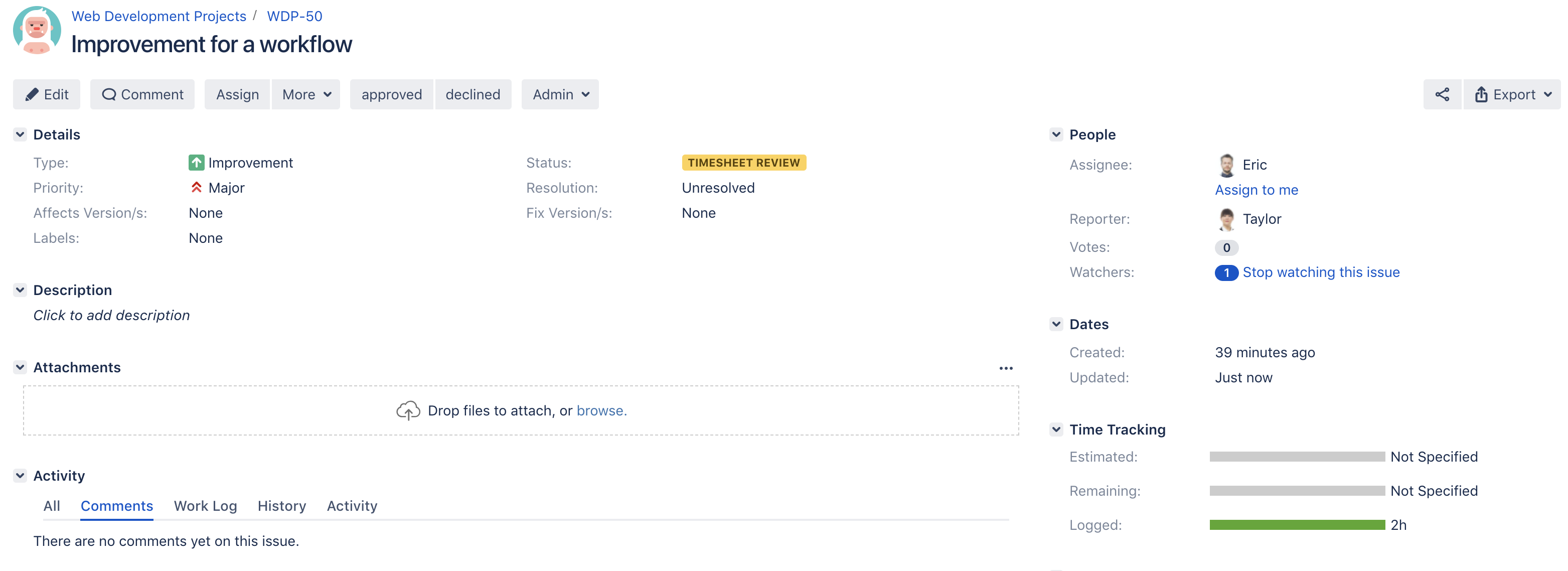 Answer | As you know, timesheets can be sent for approval to a team lead with the permission to review and approve (or reject) a timesheet. Timesheets can only be approved as a whole for the configured period (week or month). But what if you need to add an additional layer of approval to ensure that revenue recognition and project deadlines are being adhered to? Implementing an approval process for your worklogs on a Jira project level can be achieved with a Jira workflow. ![]() In the workflow above we added two Jira issue statuses before the resolved status: "Timesheet review" and "Timesheet approved”. Adding the Jira property key "jira.permission.work.denied" to these statuses with the property value of “denied” will ensure that users can no longer log time against the issue when it is in one of these statuses. This property key should also be applied to the status of resolved. Your workflow configuration will look like this when complete: ![]() The Tempo log time section in the Jira issue will be hidden when the issue is set to one of these statuses. Note that the a worklog can be modified from within the user timesheet when the issue is in this status, but no new worklogs can be created, so ideally the issue is transitioned to this status after all timesheets have been submitted. ![]() Users who attempt to log time against an issue in a restricted state will see an error message. ![]() You also have the option to add to your notification scheme that this workflow transition triggers an email to your project manager to review the work on the Jira issue. Click here for information on how to do that. And as with any workflow, you can restrict who transitions the workflow from status to status. Click here for information on how to do that. It is important to note that worklogs are displayed within Tempo reports regardless of whether or not they have been approved, and there is no indication within the report of the approval status. The approval status of a worklog can only be retrieved from the worklog servlet (using the addApprovalStatus=true parameter). |