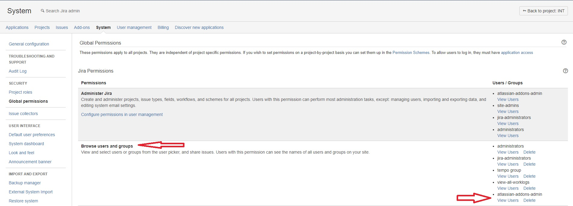 Answer | Verify if the Atlassian Add-On Administrator project role (atlassian-addon-admin) has the Browse Users permission in the JIRA Global Permissions. This permission is essential for the plugin to work properly. ![]() |