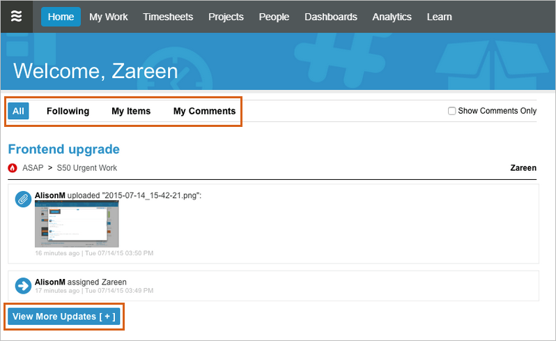 The Activity Stream on the Home tab displays recent changes and conversations across all items in your workspace. Use the toggles above the activity stream to narrow down your focus to view the recent changes of most interest to you: