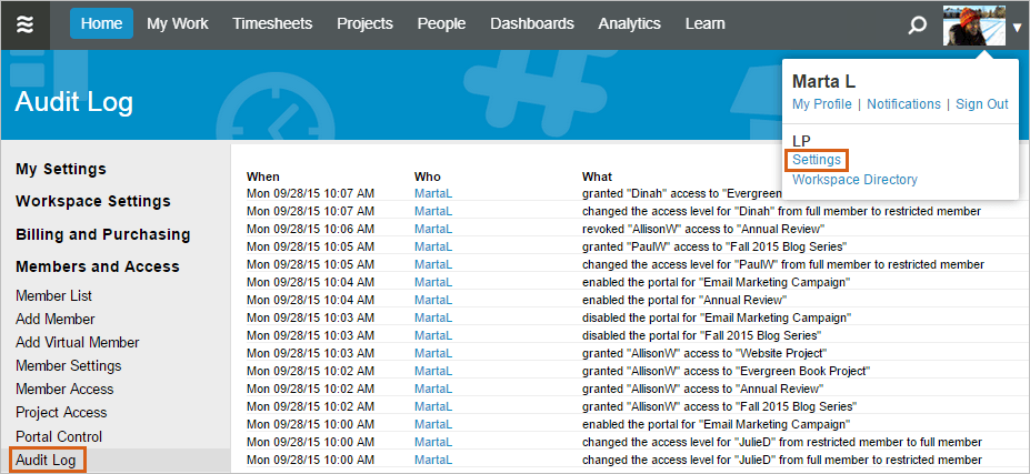 Go to your User Menu > Settings > Members and Access > Audit Log to see the history of changes to your workspace members and portal guests.