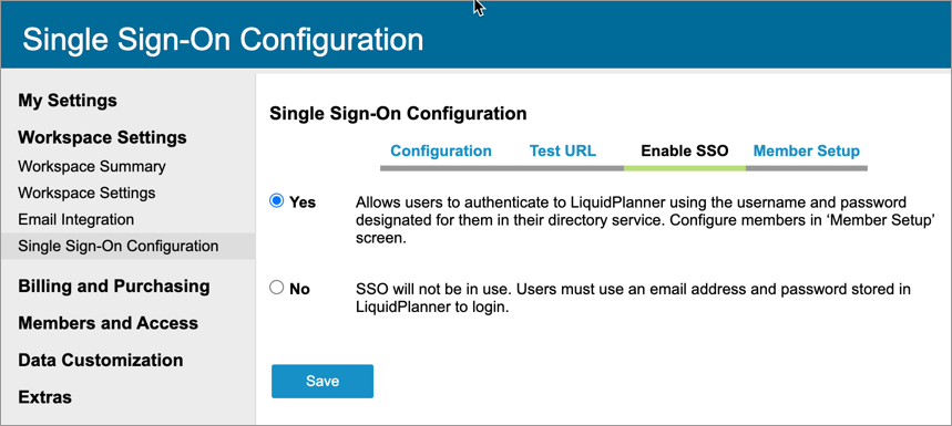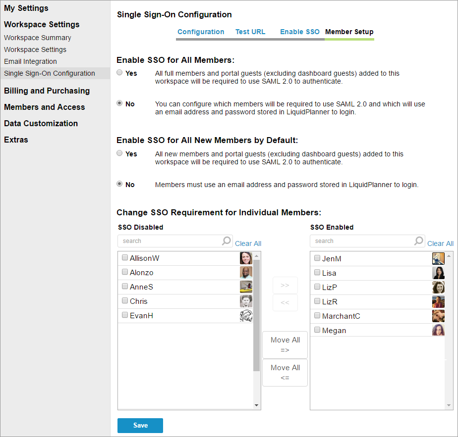 IMPORTANT NOTE: As soon as you click the Save button on this page, the workspace members who are listed under SSO Enabled will be prompted to authenticate via SSO at their next action with LiquidPlanner.
