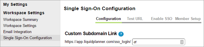 Open your Custom Subdomain Link: https://app.liquidplanner.com/sso_login/[yourCustomSubdomain] found under User Menu > Settings > Single Sign On Configuration: