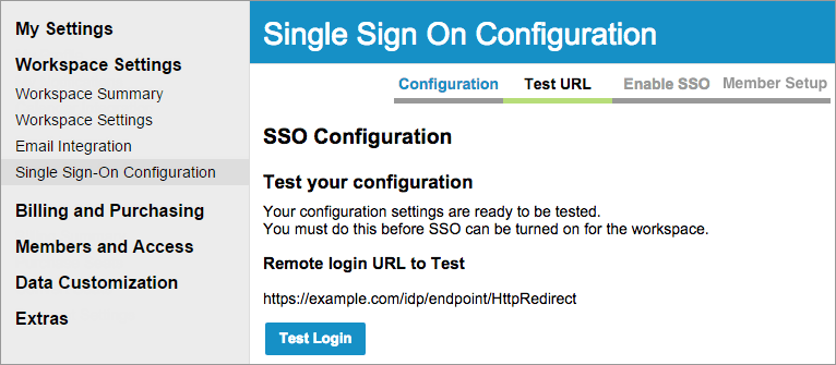 After you configure your SSO settings, you must test them. Select Test URL to do this.