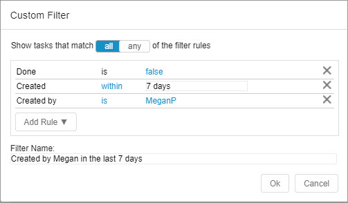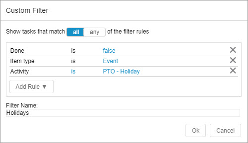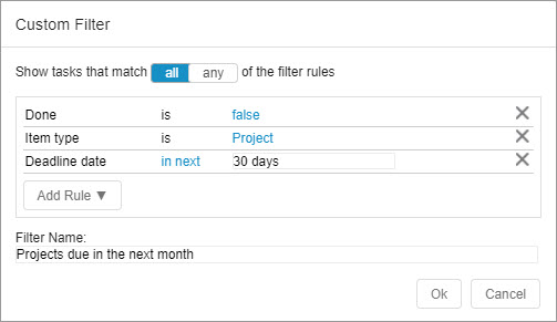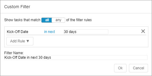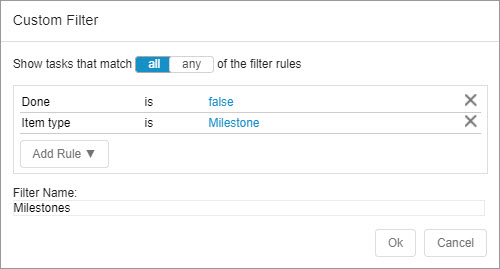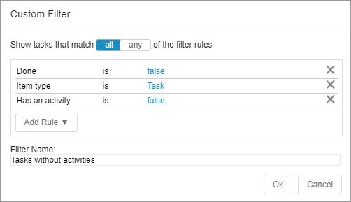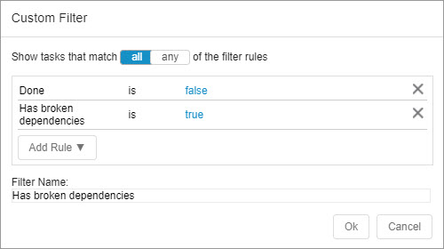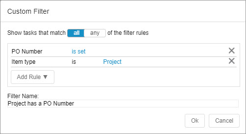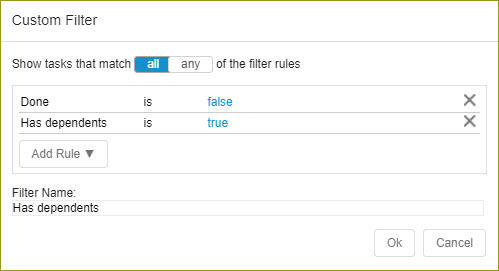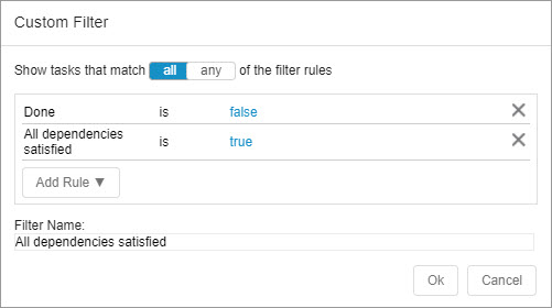 You may add rules for the following: activity, all dependencies satisfied, created, created by, date done, deadline date, delay until, earliest start, expected finish, expected remaining, has alert, has an activity, has broken dependencies, has comments, has dependents, has documents, has reference, is in a project, is late, is packaged, item type, last estimated, last updated, name, on hold, reference, shared, and uncertainty. Additionally, you can create rules to filter by your text, date, number and currency custom fields.