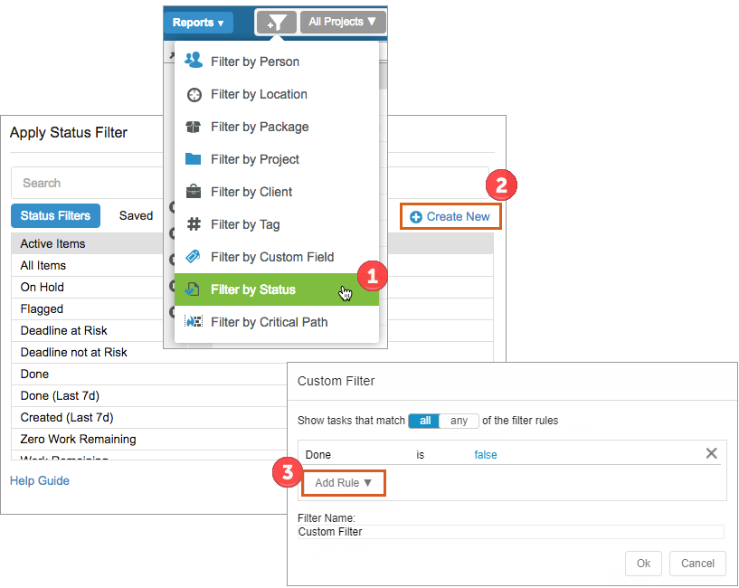 To create a custom status filter, navigate to the Projects tab and click the Filter icon > Filter by Status > Create New.