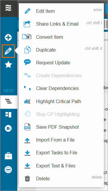 The Edit menu is the home of several features that facilitate collaboration with all project players, even those who aren’t members of your workspace. On the Projects tab, click on the pencil icon to access the edit menu: