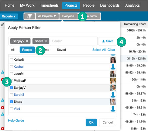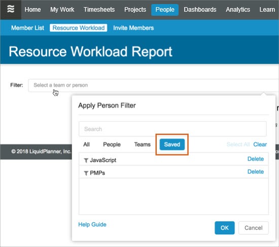 Create custom groups of people based on skills or role by using the Saved Person Filter. This can be used when you have a team member with too much work on their plate, and you need to allocate work to someone with a similar skill set.