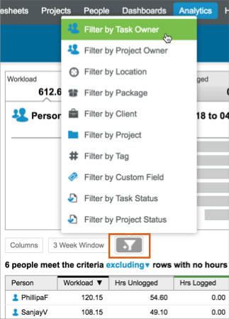 To apply the skill set filter on your Analytics reports, click on the Filter button > select Filter By Task Owner > in the Saved list, click on your saved skill set filter.