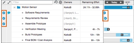 Done items have a checkmark in the left margin, and they no longer have schedule bars: