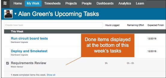 The item most recently marked done will always be visible at the bottom of This Week (as shown below). If more than one item has been marked done that week, you’ll have the option to view all done items by clicking Show all or collapse them again by clicking Hide. This allows you to easily navigate to recently completed items but hide them again to focus on your active work.