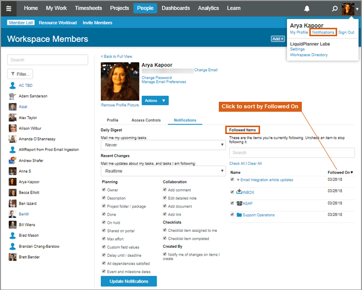 To get to this page, click your User Menu > Notifications. Here you’ll see a list of all plan items that you are currently following: